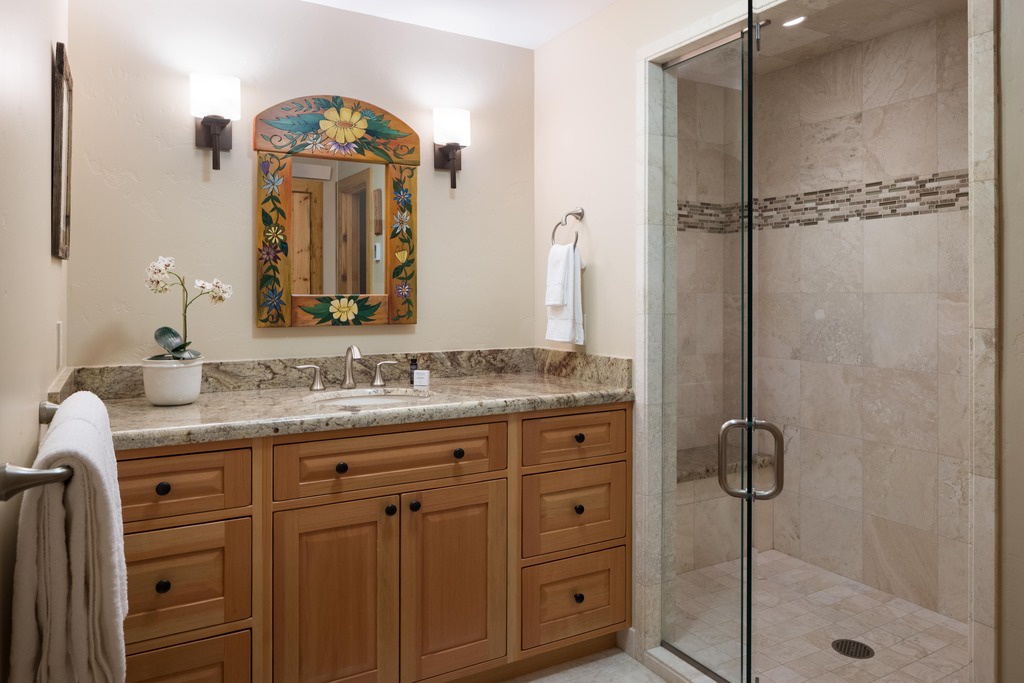 The master suite is this home's height of comfort. A California king bed sits in front of doors leading to the elevated porch. Floor-to-ceiling bookshelves flank the bed, making nightly reading all the easier. A walk-in closet makes unpacking effortless, and the en suite bathroom features dual vanities and an expansive steam shower.