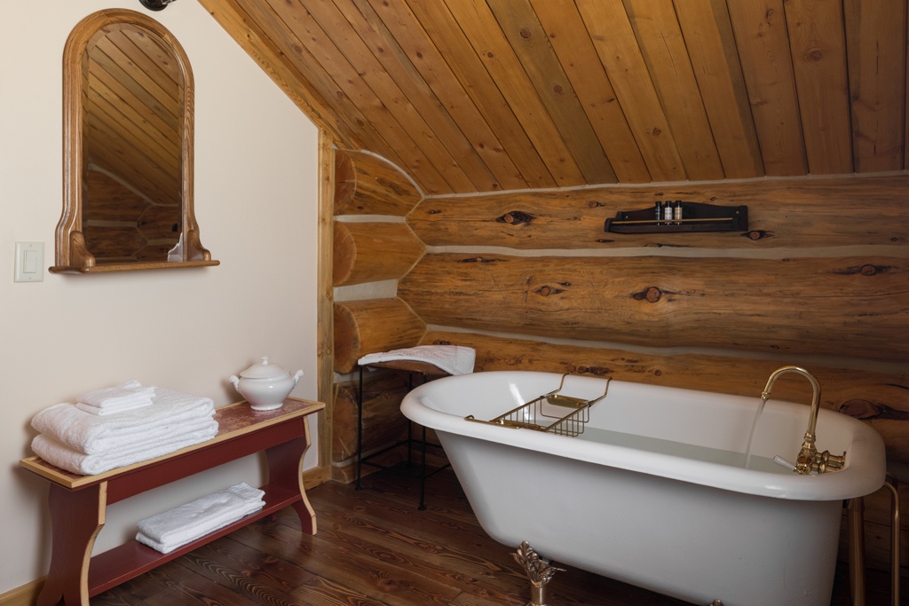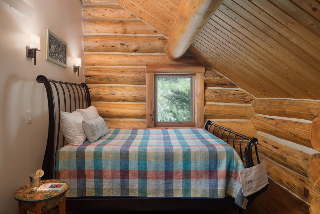 A trip back to the spiral staircase leads to the loft. The private space offered by the loft gives a complete view of the great room and this home's magnificent ceilings. A desk next to the stairs is the perfect spot to write and reflect on your experiences at Bluebell Cabin and in Jackson Hole. The queen bedroom and a bathroom complete with a claw-foot tub make the loft its own miniature suite.