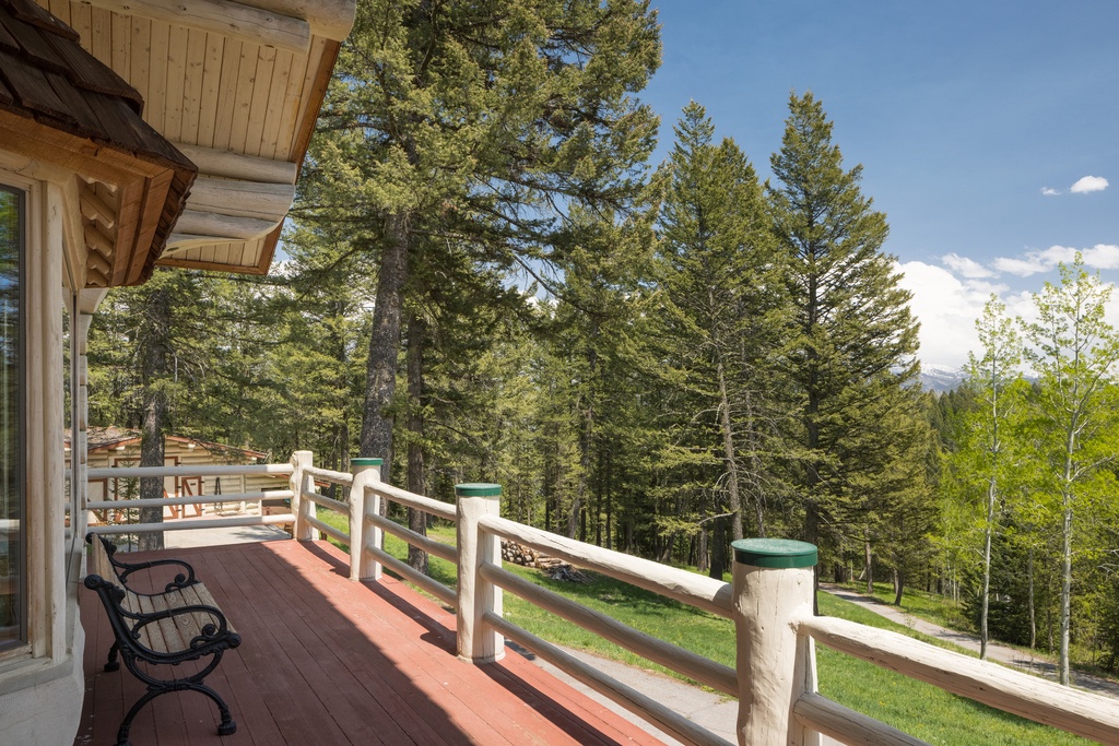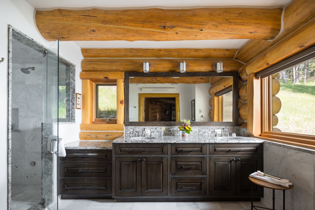 The home's centerpiece, a spiral staircase made of whole, cut logs, leads to Bluebell Cabin's main level and great room. The vaulted ceilings and wide windows of the great room fill the space with warm, natural light. The rustic grace of the room is further enhanced by the bold decor of contemporary Western art, leather armchairs, and a stone fireplace. The great room transitions into the kitchen and powder room. Modern appliances and fixtures are complimented by granite counter tops, and a large wooden table invites everyone together for memorable dinners. On a warm summer day, everyone can move outside to the porch's picnic table for a home-cooked meal.