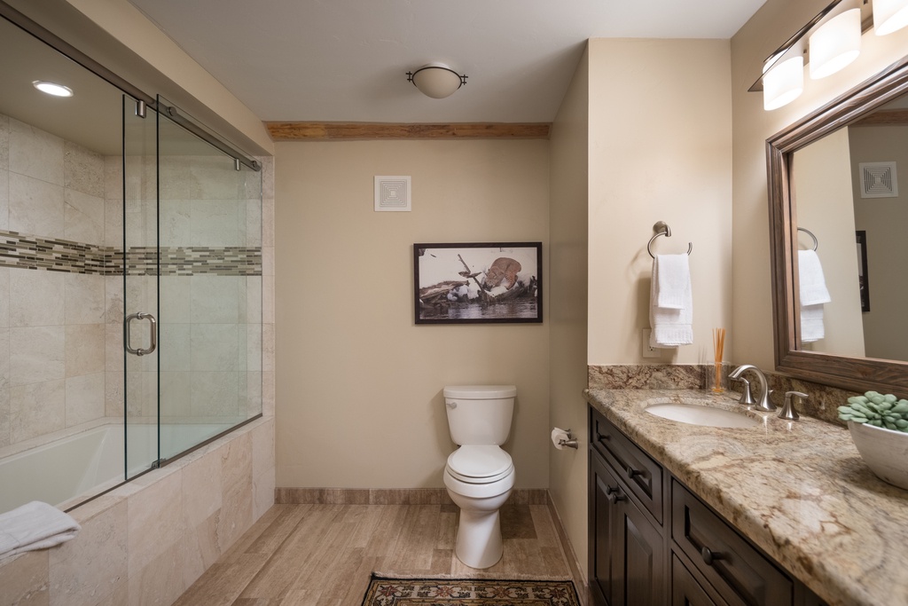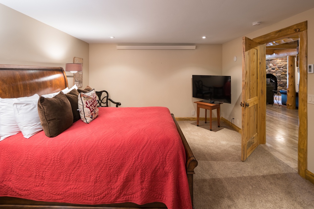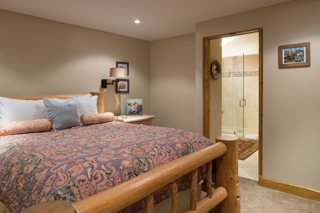 The lower level entrance to Bluebell Cabin greets its guests with stone and wood. A two-car garage allows guests to park their cars away from the elements. The wooden porch's walkway leads to a set of large doors framed by river stone. Before entering through the double doors, a moment on the wagon wheel bench reveal a world of pine trees and aspens and reminds you that this is a place of peace and quiet. Once inside, the downstairs living area provides a taste of the Bluebell Cabin's fullest offerings. Plush sofas, a wood-burning stove, and a flat-screen television make this area the perfect place for movie night. Wooden cabinets provide plenty of space to store your gear and a laundry room helps you keep it clean. One guest bedroom features a queen size bed and an en suite bathroom. A detached, full bathroom serves the second guest bedroom furnished with a queen size bed.