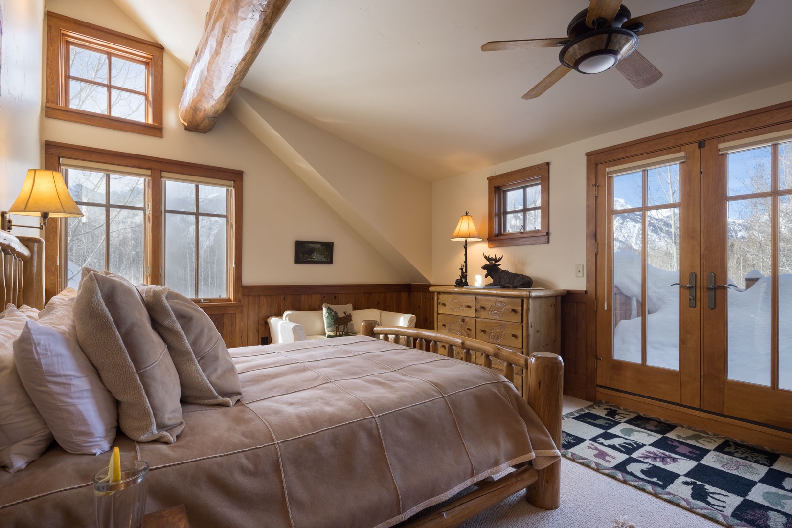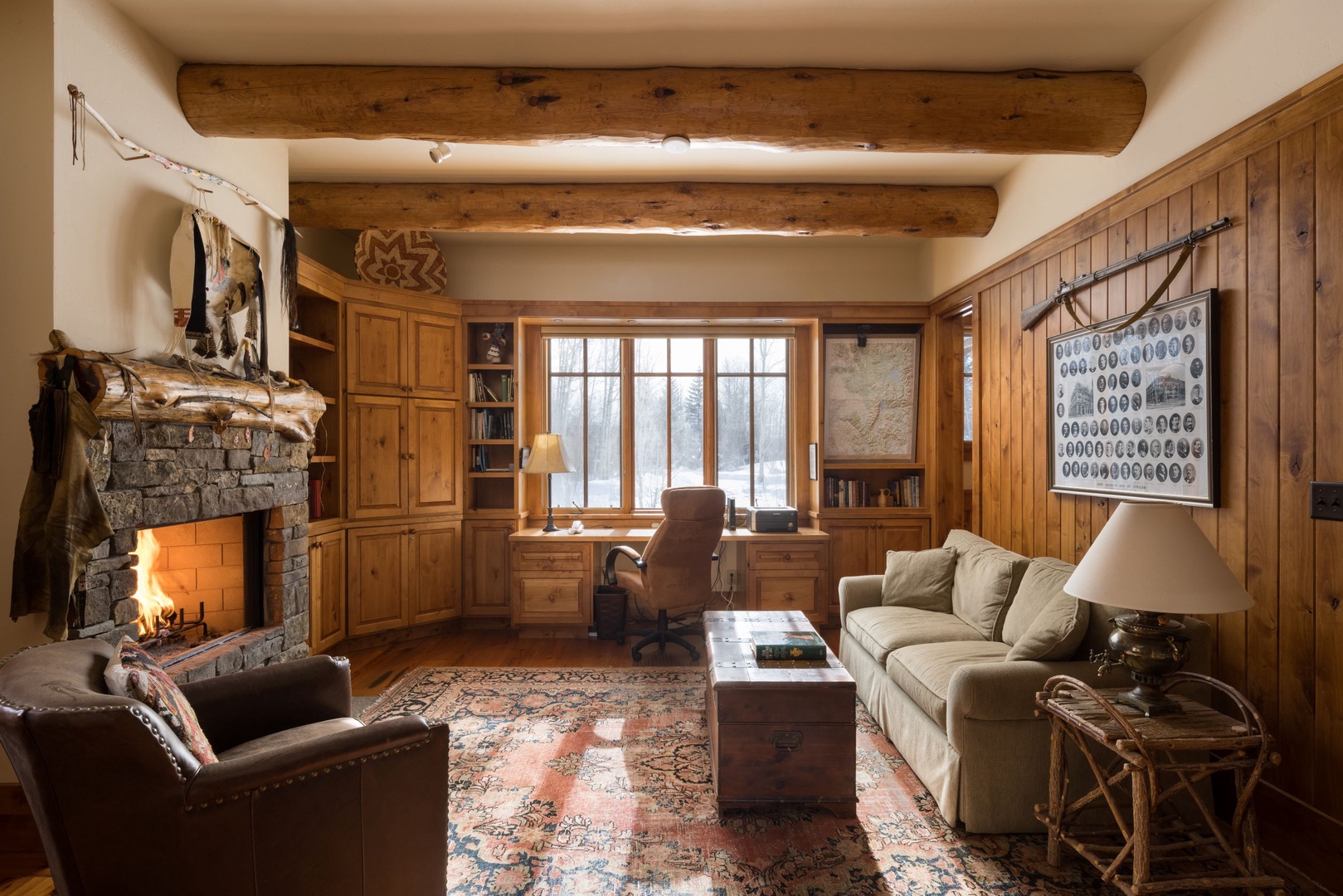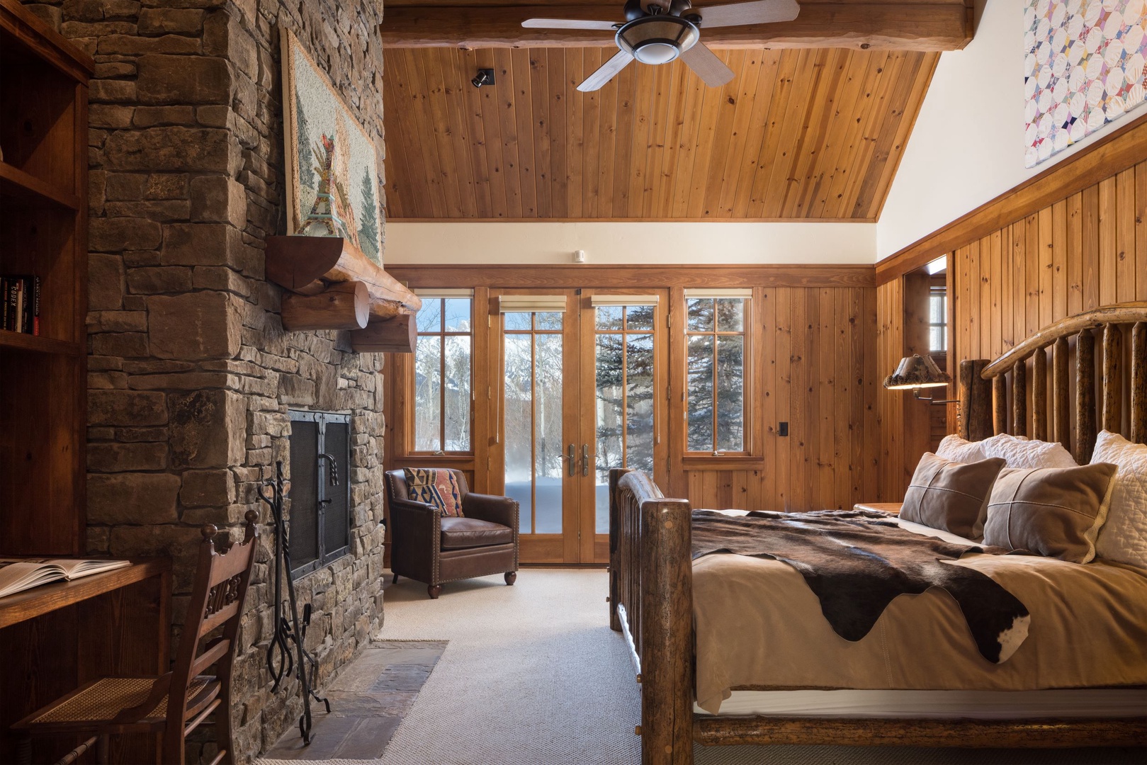 The west wing of the home holds the primary bedroom and lounge. Comfortably appointed with a cozy stone fireplace, the lounge functions as both practical and playful with a collection of antique firearms and other unique collectables. A desk is available for those who need to get a bit of work done, though we encourage relaxation while visiting Jackson Hole! A king bed and fireplace outfit the primary bedroom, with an attached private bath.