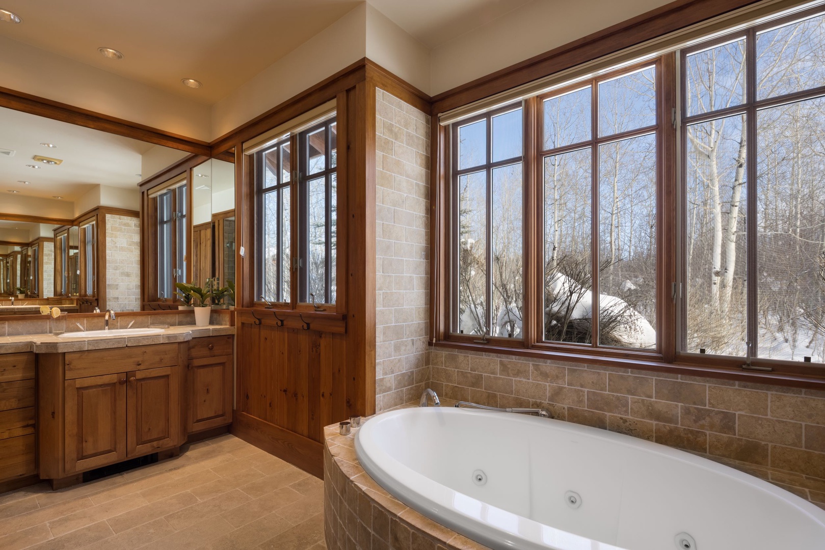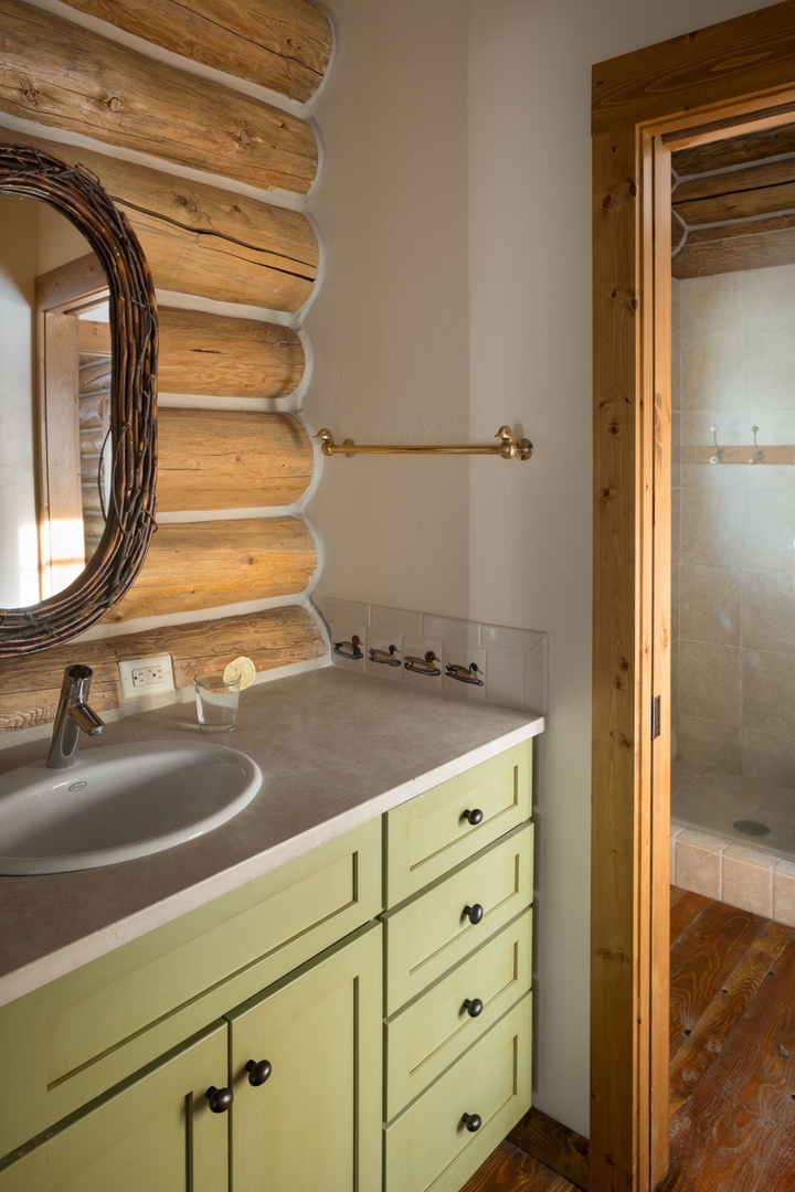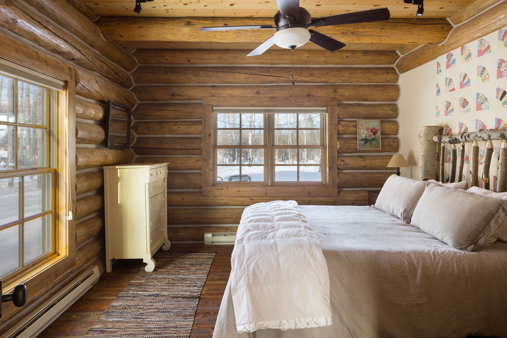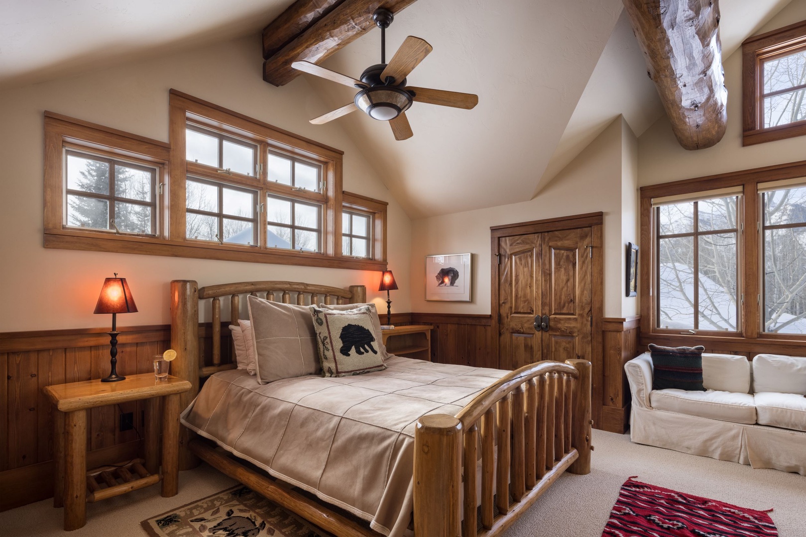 The west wing of the home holds the primary bedroom and lounge. Comfortably appointed with a cozy stone fireplace, the lounge functions as both practical and playful with a collection of antique firearms and other unique collectables. A desk is available for those who need to get a bit of work done, though we encourage relaxation while visiting Jackson Hole! A king bed and fireplace outfit the primary bedroom, with an attached private bath.
