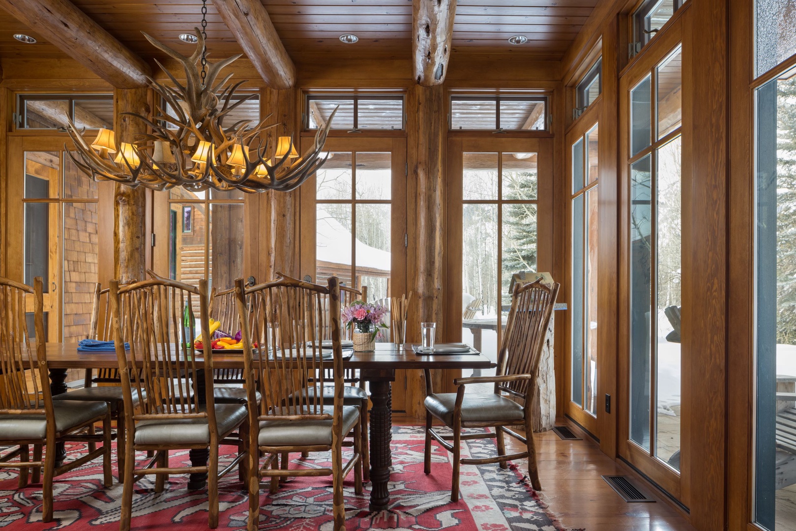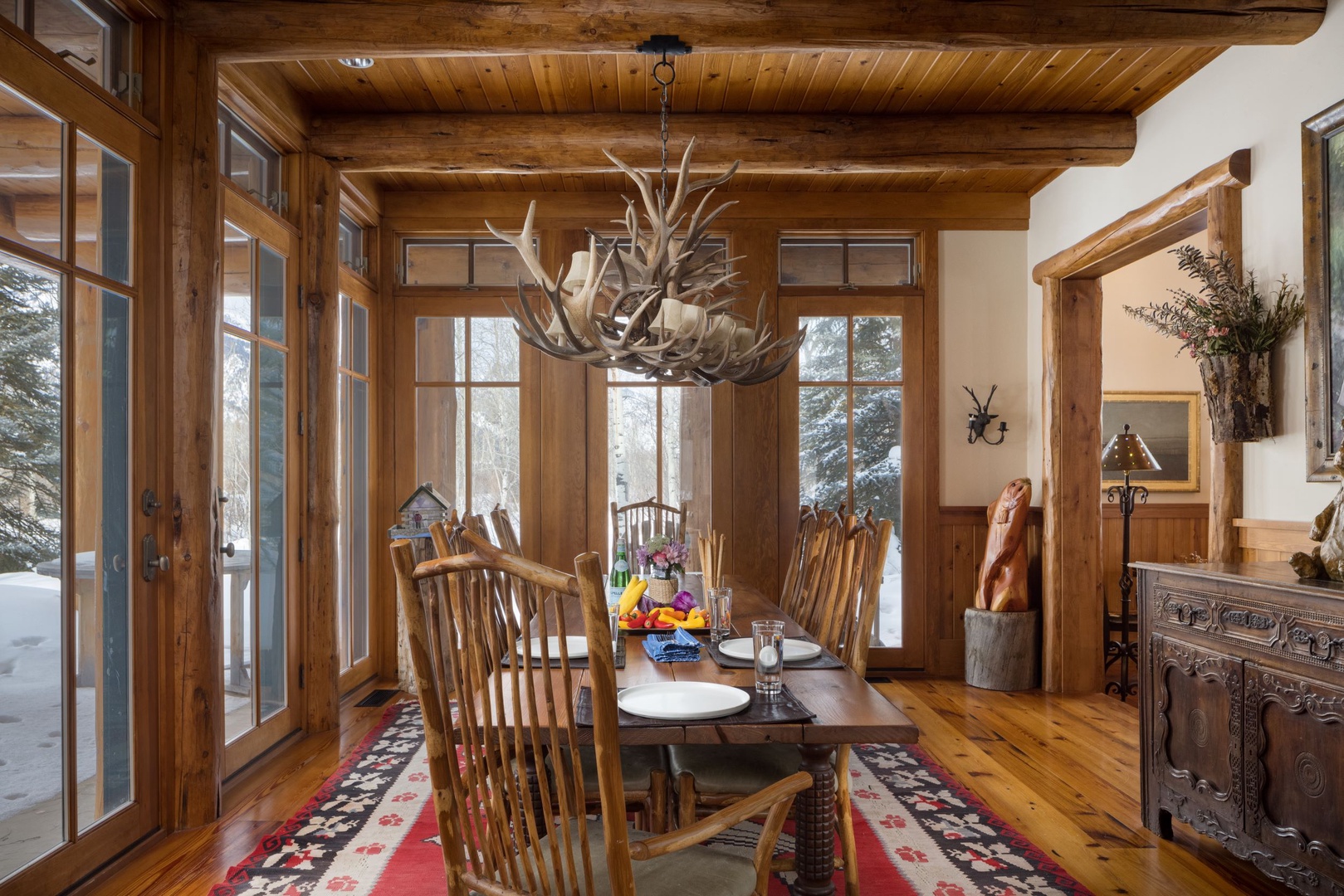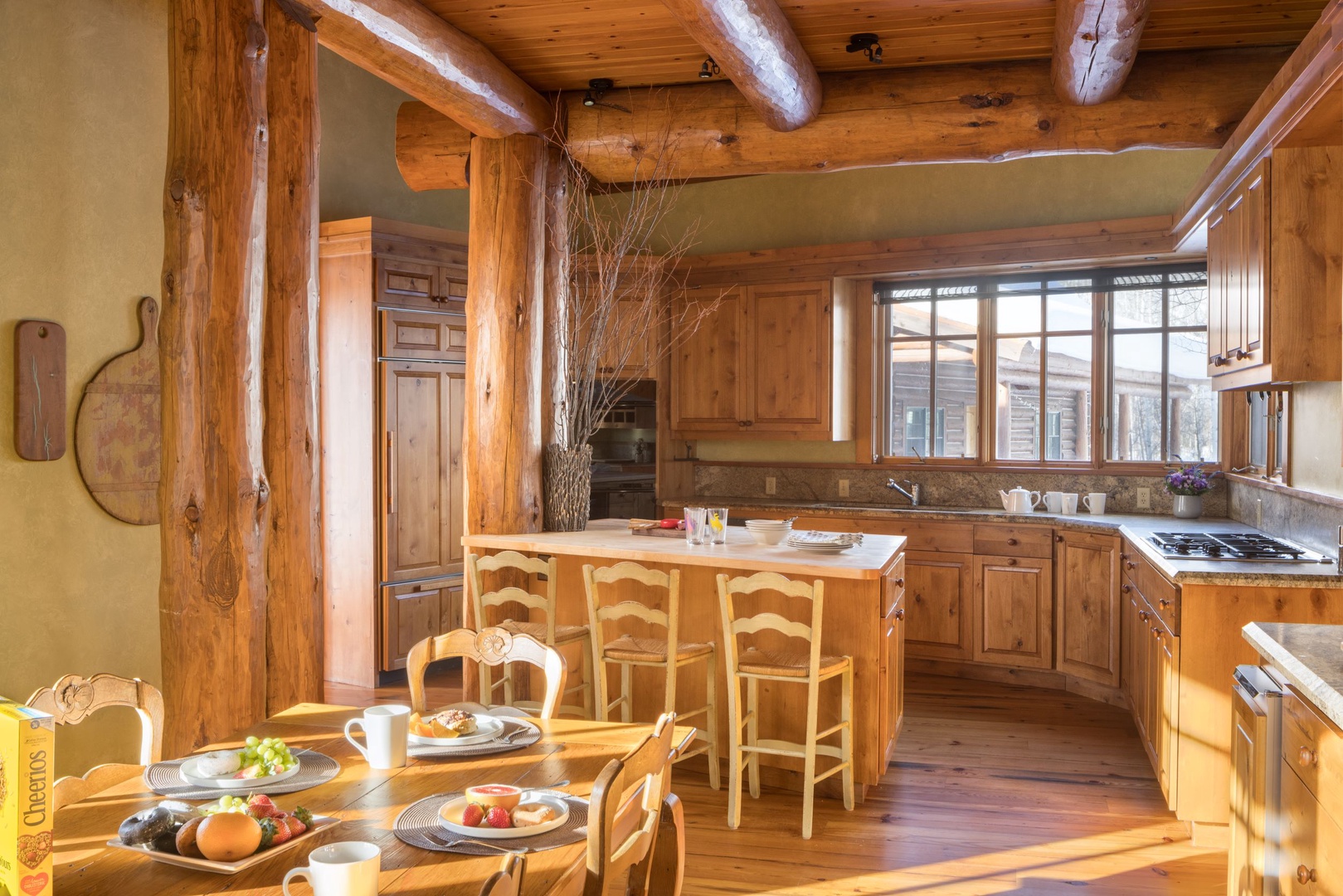 Stepping into the grand entry way, guests are greeted by a large living room adorned with floor to ceiling windows and views of the cathedral group. Plenty of seating for all to gather and enjoy each others company. A roaring fire can be made in the homes main fireplace to add to the ambiance of this Wyoming lodge. Follow the hallway to the dining room, where a table suitable for eight can be found surrounded by more windows, each with its own view. A authentic elk antler chandelier crowns this room from above. Moving into the kitchen, guests will find additional dining space available to them for a more casual meal or overflow seating. The kitchen boasts a sizeable island and ample counter space for cooking, serving, dining and delighting.