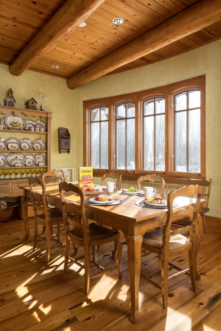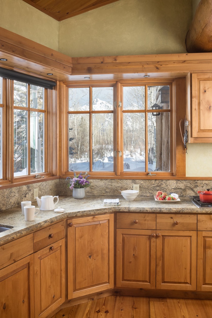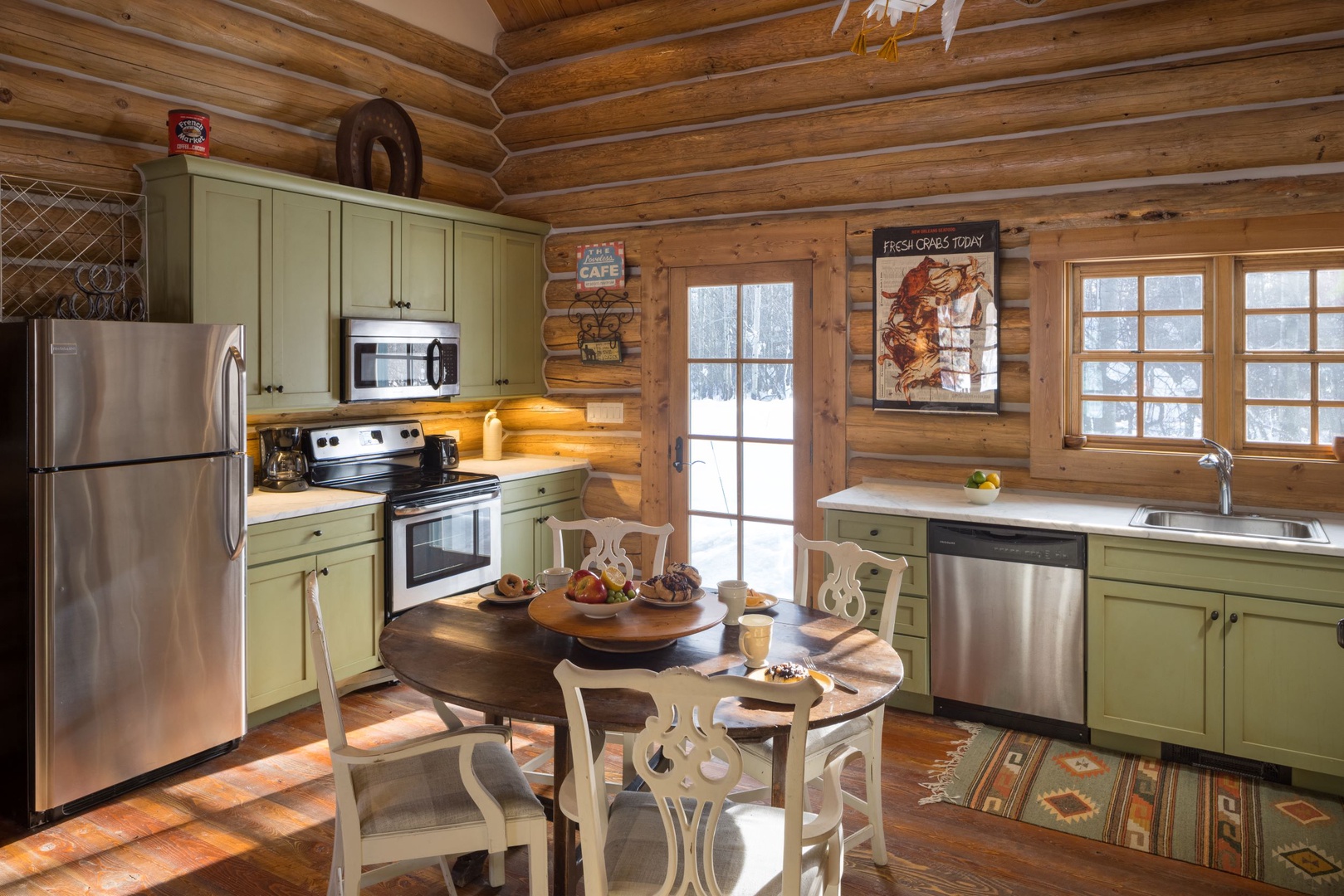 Stepping into the grand entry way, guests are greeted by a large living room adorned with floor to ceiling windows and views of the cathedral group. Plenty of seating for all to gather and enjoy each others company. A roaring fire can be made in the homes main fireplace to add to the ambiance of this Wyoming lodge. Follow the hallway to the dining room, where a table suitable for eight can be found surrounded by more windows, each with its own view. A authentic elk antler chandelier crowns this room from above. Moving into the kitchen, guests will find additional dining space available to them for a more casual meal or overflow seating. The kitchen boasts a sizeable island and ample counter space for cooking, serving, dining and delighting.