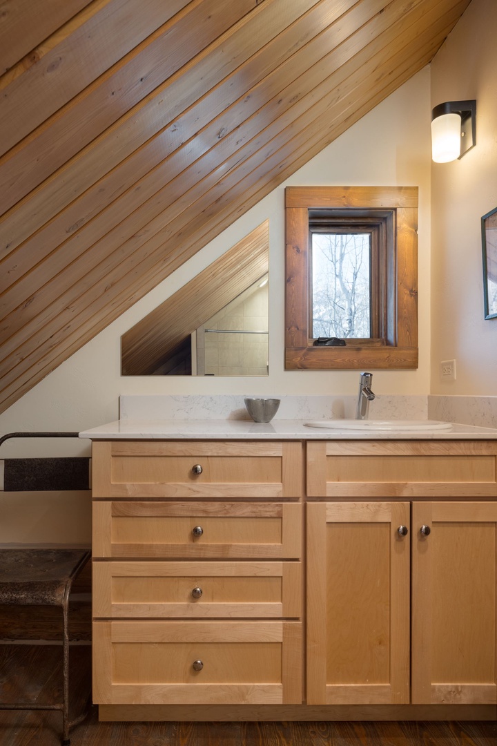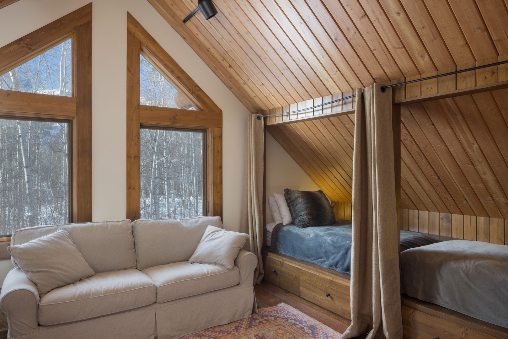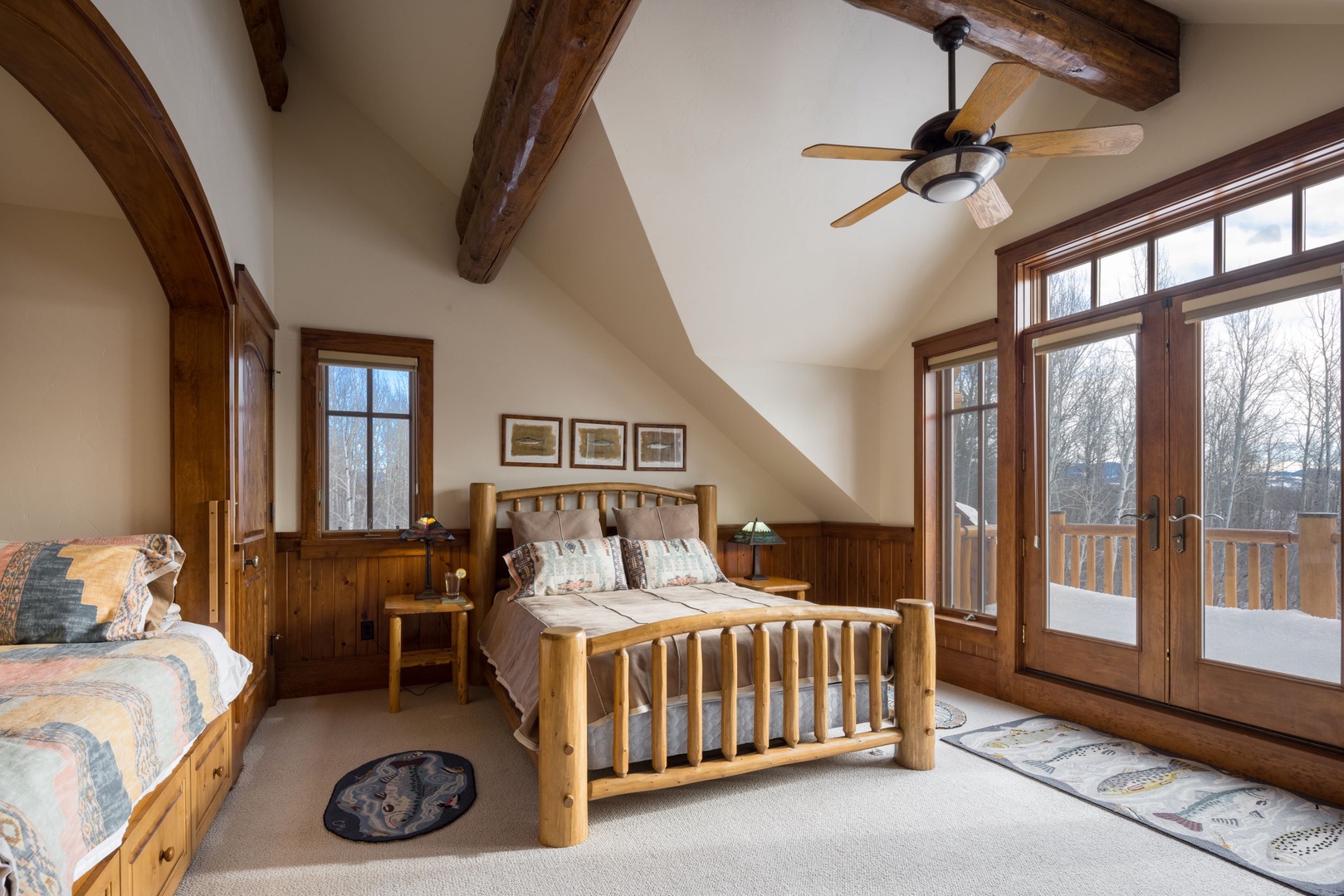The guest house, located mere steps across the lawn, is a recently built quaint little structure perfect for families who need a bit of privacy at the end of the day. The main floor consists of an open concept living room and kitchen, neatly designed for practicality and efficiency with an entrance to the primary bedroom where they will find a king bed waiting to greet them after a day of adventure in Jackson. A walk through the laundry room and bath also connects the kitchen to the primary bedroom. The log staircase brings guests to the final bedroom and full bath of this incredible home. Twin built ins are available in this room, along with a sofa sleeper if extra space is required for the littlest members of the party. Slanted ceilings make this room best for children, but can be suitable for all as long as they are willing to watch their heads!
