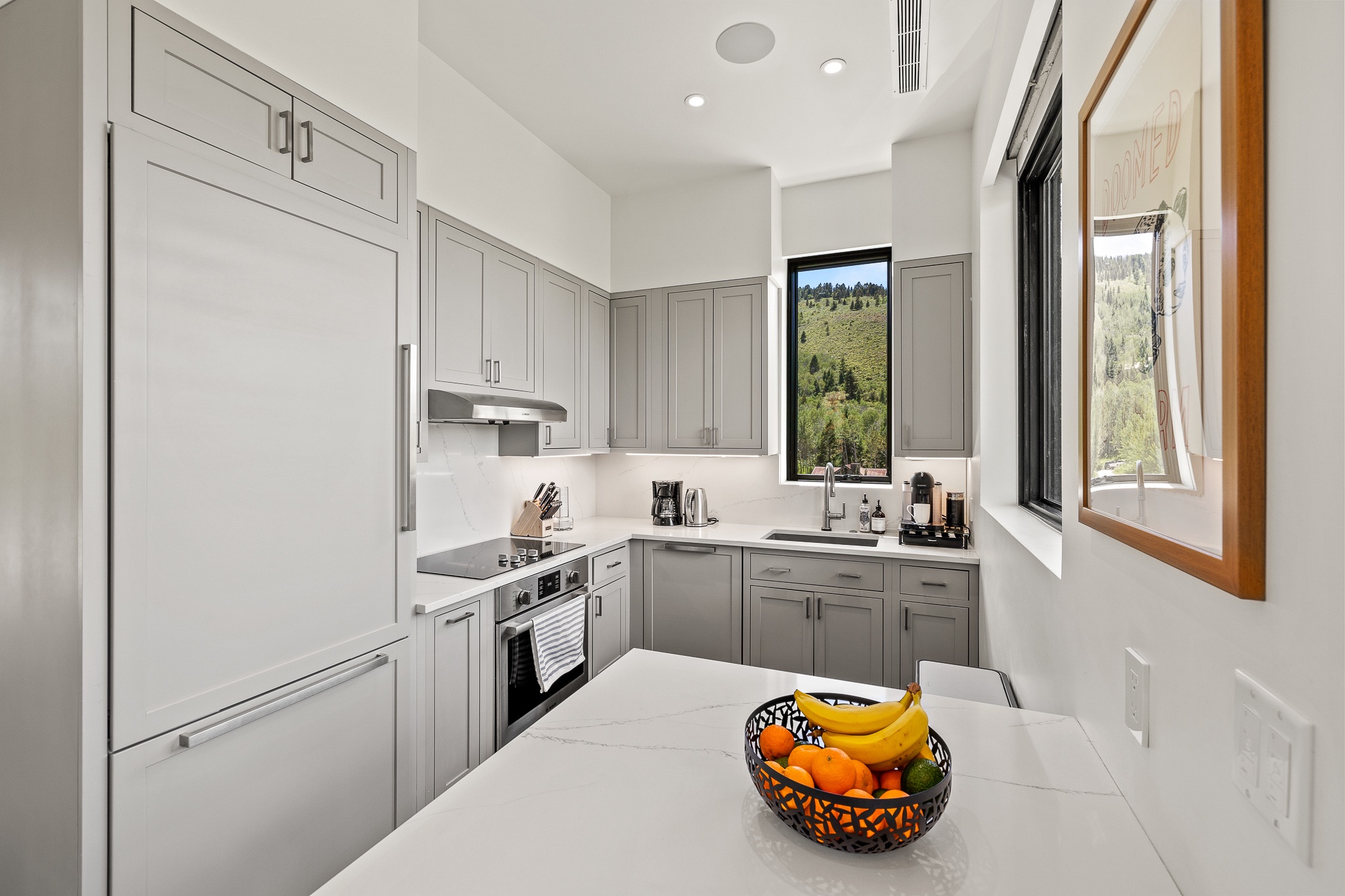 On the main floor, guests are greeted by a spacious and inviting atmosphere. A full kitchen, TV area, and gas fireplace sitting area provide the perfect setting for relaxation. Just off the kitchen, a balcony beckons with a private hot tub, BBQ, and a sitting area that offers unparalleled views of the majestic Tetons.