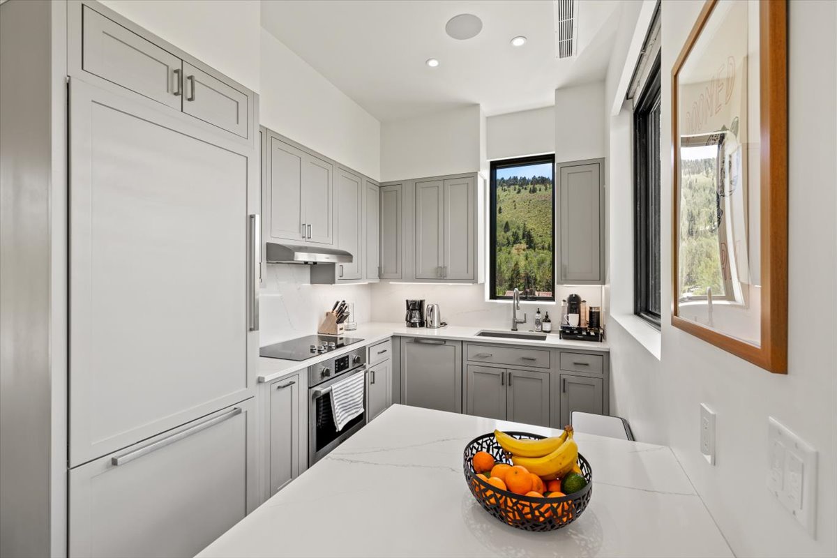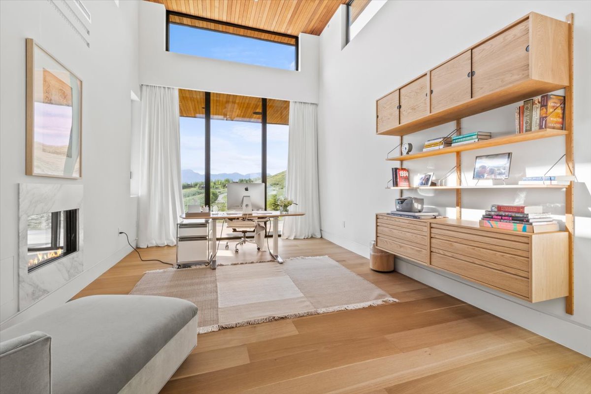 The lower level is a walk-out scenario and encompasses a small living/study area, a gym with a massage room, and a spa room. The spa room/gym features a steam room, a private shower, a powder room, a massage table, weights and equipment, Peloton fitness equipment, a lululemon workout mirror, and yoga mats. Outside, you'll find a saltwater hot tub with expansive mountain views and a saltwater lap pool with glass walls that slide, connecting the indoor and outdoor spaces. Radiant heated exterior walkways keep areas around the home snow-free. Entertainment options abound with a media and entertainment room on the lower floor, complete with games and books. There is also another bedroom with twin beds and a working desk, which can be converted into a king bed upon request.