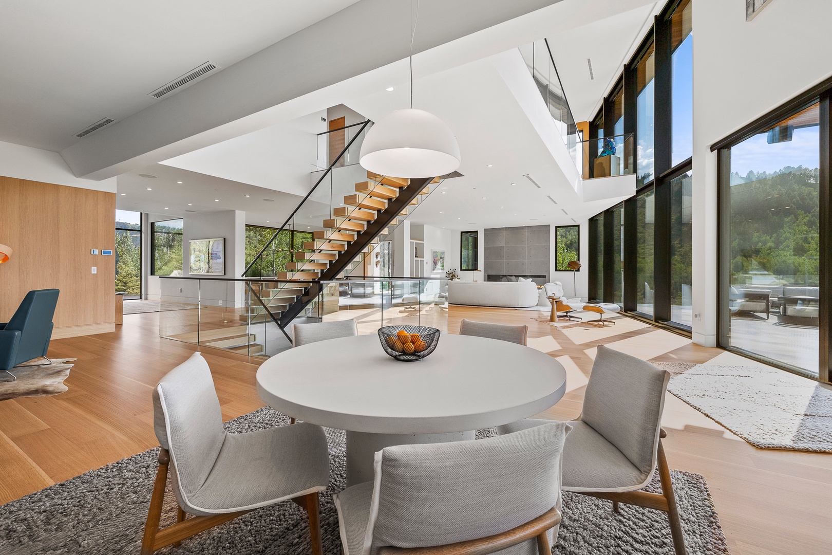 The main floor is designed for seamless indoor and outdoor living and features a great room, indoor and outdoor dining areas, an office, a beautiful kitchen, a formal entry, a mudroom, and a garage. The great room is the heart of the home, with a large fireplace, a spacious dining area, and a well-equipped kitchen. The office boasts breathtaking 270-degree views. Extensive patios on the main floor offer outdoor kitchen facilities, a large dining area, a living room area with a gas fireplace and umbrellas, and outdoor heating.