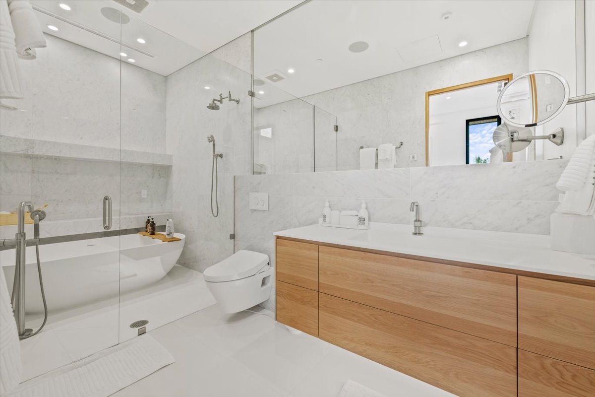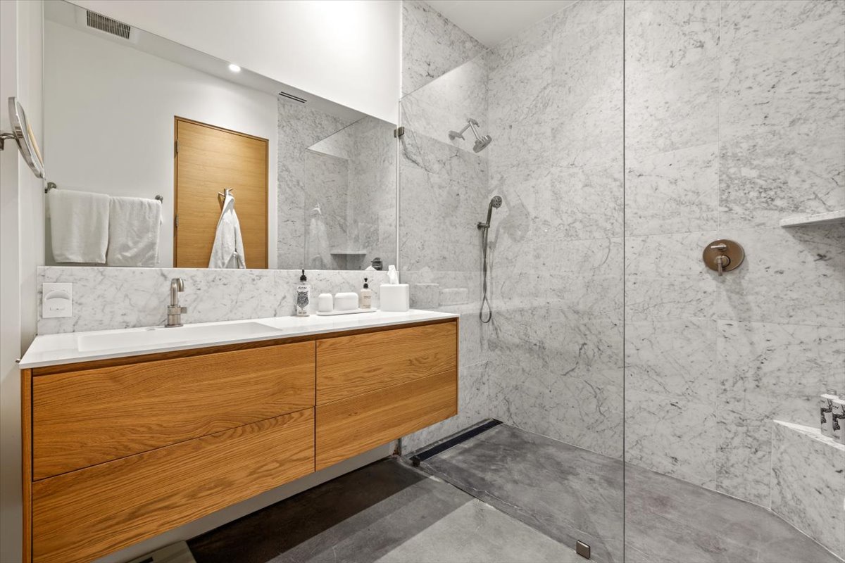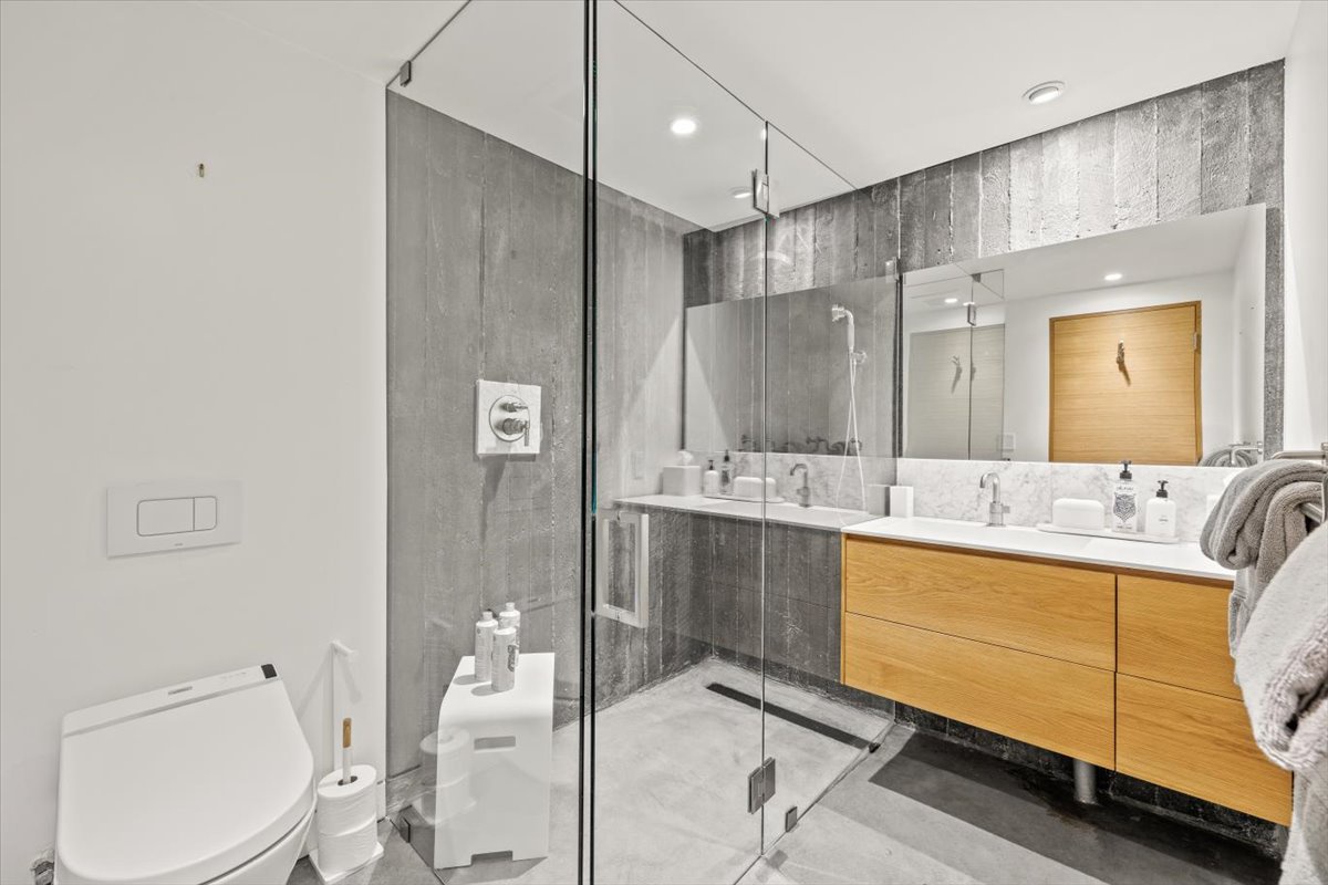 The guest home on the property offers 3 bedrooms with en suite baths, providing comfortable and private accommodations for additional guests. The upper level of the guest home features 2 en suite bedrooms with queen beds, a living area with a gas fireplace, a kitchen, a small dining area, a living room, and a private hot tub and grill area on the deck. The ground level includes a 1-car garage, a living room, and an en suite bedroom with 2 double beds.