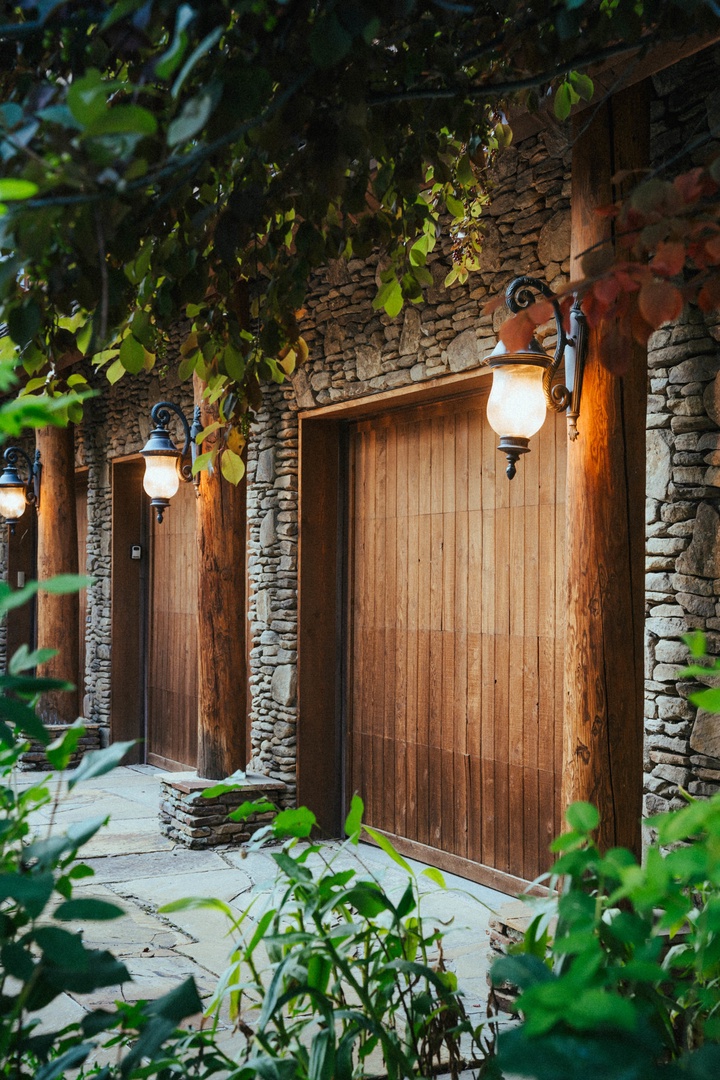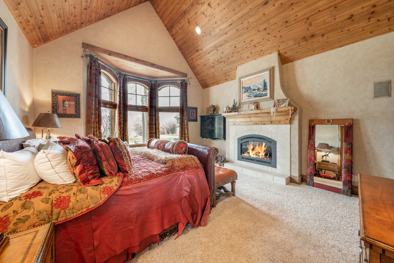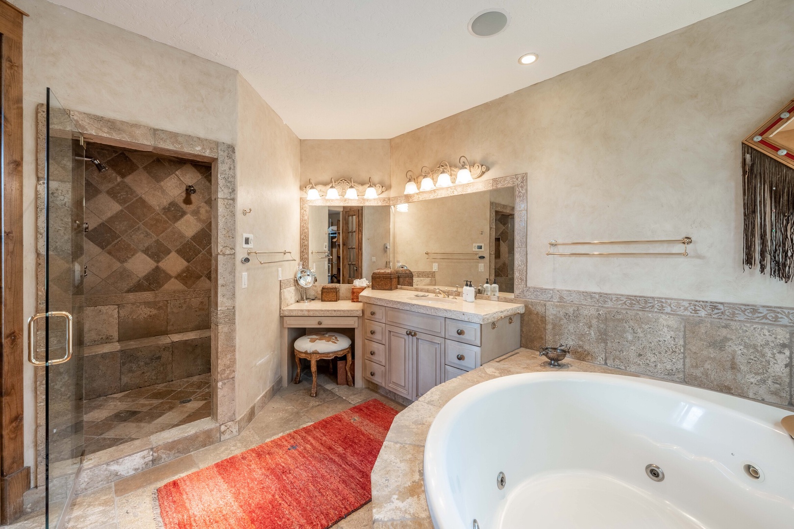 Also on the first floor is the master bedroom. When walking into the master bedroom, guests have a grand entrance with a stone entryway. The master is furnished with a lush king bed and gas fireplace. The master has large windows that overlook the backyard. The master has its own large ensuite furnished with a large soaking tub, a walk-in shower, two vanities, and a massive walk-in closet!