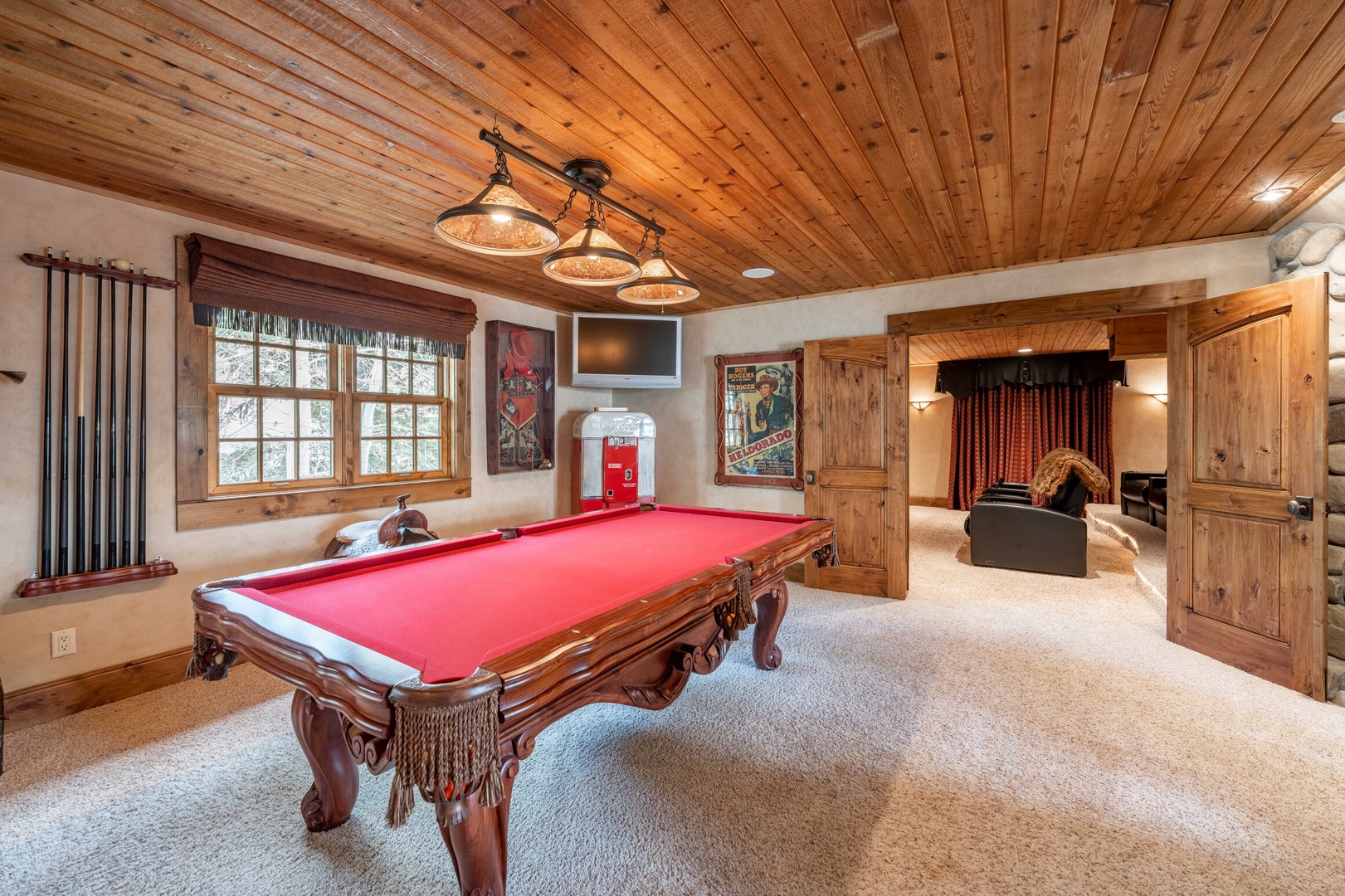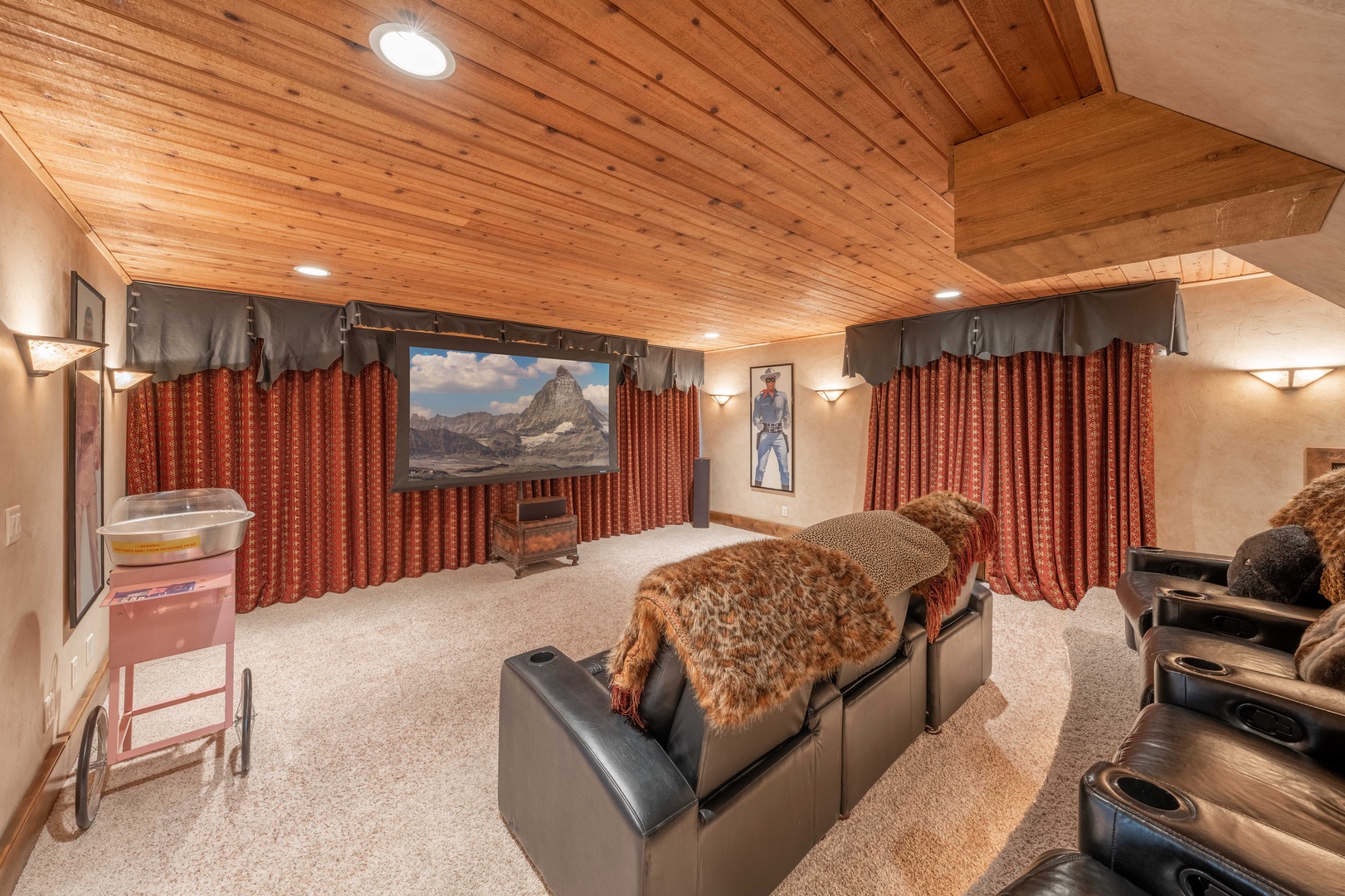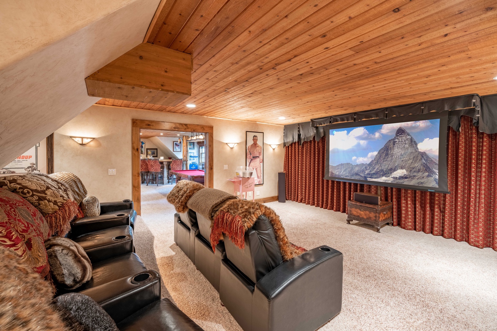 Also, on the second floor, guests will find a large game room furnished with a pool table, sitting area, TV, and Bar. Attached to the game room is a large theater room with a projector screen and eleven large plush reclining chairs. Guests will be sure to have an amazing in-home movie night in this theater!